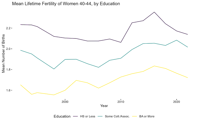 American readers may wonder if similar trends are evident here, so I took a look at the Census’s Current Population Survey, in particular at the total number of births reported by women ages 40-44 since 1992 (i.e., those born from about the 1950s through the early 1980s). I divided education levels into high school or less, some college, and a BA or more.2