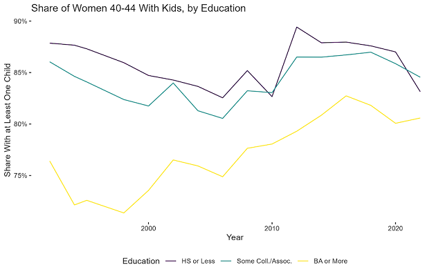 One interesting fact (as others have noted as well) is that higher-educated women are less likely to remain childless than they used to be—though the same point about selection applies here as in Finland. (The BA-or-more share rises from about a quarter to about half of the sample from the left of this chart to the right.) But at any rate, there’s little hint of an imminent crossover where the highest-educated women will consistently be the most likely to become mothers.