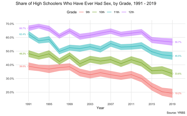 In 2019, some 38.4% of high schoolers reported that they had ever had sex, down from 39.5% in 2017, 46% in 2009, and 54% in 1991. (The YRBS only tracks frequency of "sexual intercourse" and does not ask about other sex-related but non-intercourse activities.)