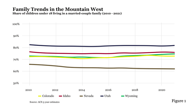 No state in the Union has as many men, women, and children in married households as the Beehive State. In 2021, 55% of adults in Utah (age 18-55) were married and 82% of its children were living in married-couple families. This compares to 45% of adults married and 75% of kids living in married families nationally. Utah’s regional family strength is visible in Figure 1, which shows how the state compares to other states in the region on the latter outcome.