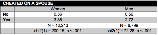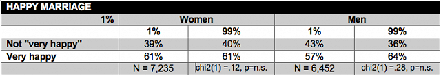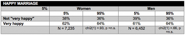 The happiness story changes when promiscuous Americans get married. These respondents are not more or less happy in their relationships than their non-promiscuous peers. Some may have relegated their infidelities to their first marriages. A small number may be in polyamorous or other forms of open relationships, although it’s impossible to know with these data.