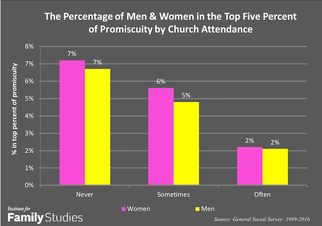 Religious participation also has the anticipated negative correlation with promiscuity: the most sexually adventurous Americans are least likely to attend religious services. Regular attendance (defined as several times a month or more) translates into the lowest odds of sexual sybaritism. Only 2% of survey respondents who attend religious service regularly fall into the top five percentile of promiscuity, whereas 7% of non-attenders do. Occasional attendance produces middling rates of sexual adventurism. Regularly darkening the door of a church, synagogue, or mosque may both reinforce doctrinal proscriptions against promiscuity and offer social reinforcement about the desirability of monogamy.