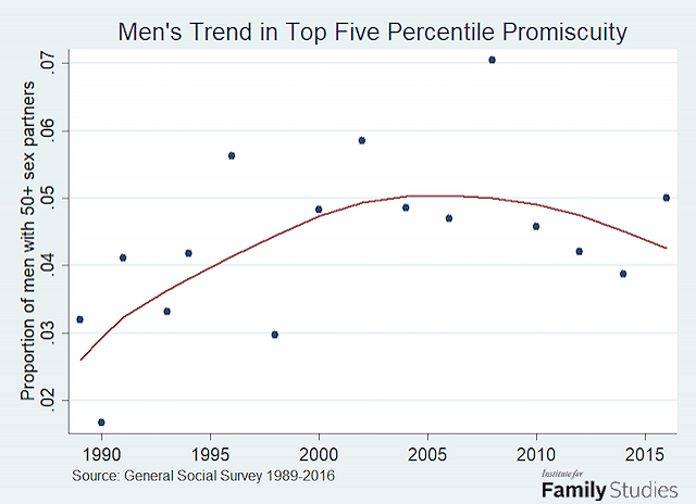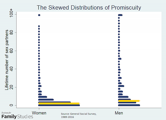 My examination focuses on the upper five percentiles of promiscuity; in other words, the 5% of Americans who report having more sex partners than the other 95 percent. I also look at the top one percentile of promiscuity where there are sufficient sample sizes to do so. Except where noted, the results are similar for the top-five and top-one percent of promiscuity. Finally, my tally of sex partners ignores sexual orientation.