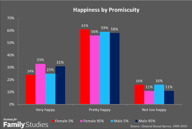 There are modest but still statistically significant differences in respondent happiness by promiscuity. The 5% most promiscuous respondents of both sexes are less likely to report being “very happy” and more likely to say they are “not too happy.” This pattern holds for women when looking at the top one percentile of promiscuity, but not men. In other words, men who report having had 150 or more sex partners are not any happier or unhappier than their non-Lothario counterparts, but that’s not true for women.