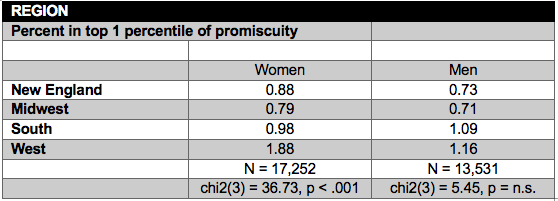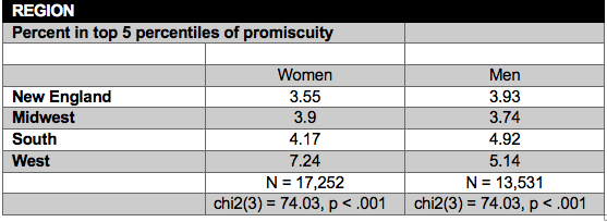 It’s also predictable that the promiscuous are less religious than other Americans, but there are nevertheless interesting differences by denominational affiliation. Christians are the least likely to fall into the top 5% of the promiscuity distribution. Still, in terms of sheer percentage points, the differences between Christians and nonbelievers are not enormous. When it comes to “Other” faiths (including Muslims, Hindus, and myriad less common religions), the men behave like Christians. Other-faith women are more likely to reside in Promiscuous America Of all survey respondents to claim a denominational affiliation, Jews are the most likely to report high promiscuity (8% of Jewish women, 6% of Jewish men). The highest levels of promiscuity naturally belong to Americans who don’t claim a denominational affiliation. This includes 10% of unaffiliated women, and 7% of unaffiliated men.