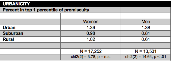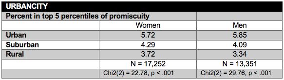 The residents of Promiscuous America are predictable in many ways. They’re less likely to be married and more likely to be divorced. They’re several times as likely as their less adventurous peers to have cheated on a spouse. They watch more porn. They’re more likely to be political liberals than moderates or conservatives. Many of them live in the western United States (for women, that means the intermountain west more than the west coast). They’re more likely to live in cities than in suburbs or rural areas.