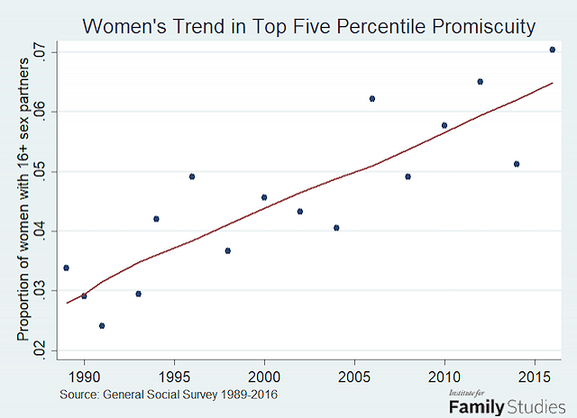 Contrary to public perception, typical sexual behavior hasn’t changed much in recent decades. But there will always be outliers, Americans who have a multitude of sex partners. This behavior is becoming more common for women, but less common for men. Perhaps these women are experiencing the last stages of the Sexual Revolution, stages that came earlier to men. It’s evidence for this proposition that there is no male equivalent to the term “slut shaming.”