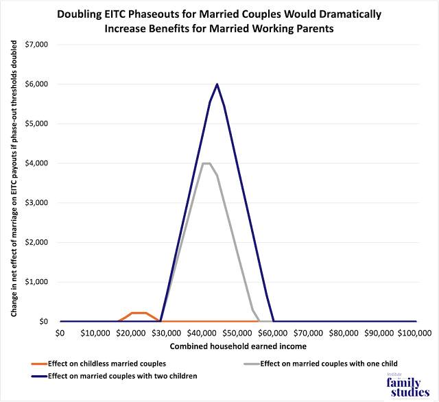 We propose that phase-out thresholds should always be exactly double the single thresholds for married couples. The graph below shows what effect this would have on married couples vs. current law. This program would hugely increase subsidies for marriage, partially remedy an existing anti-marriage bias in the tax code, and avoid creating new work disincentives for low-income households, as some scholars worry child allowances might.