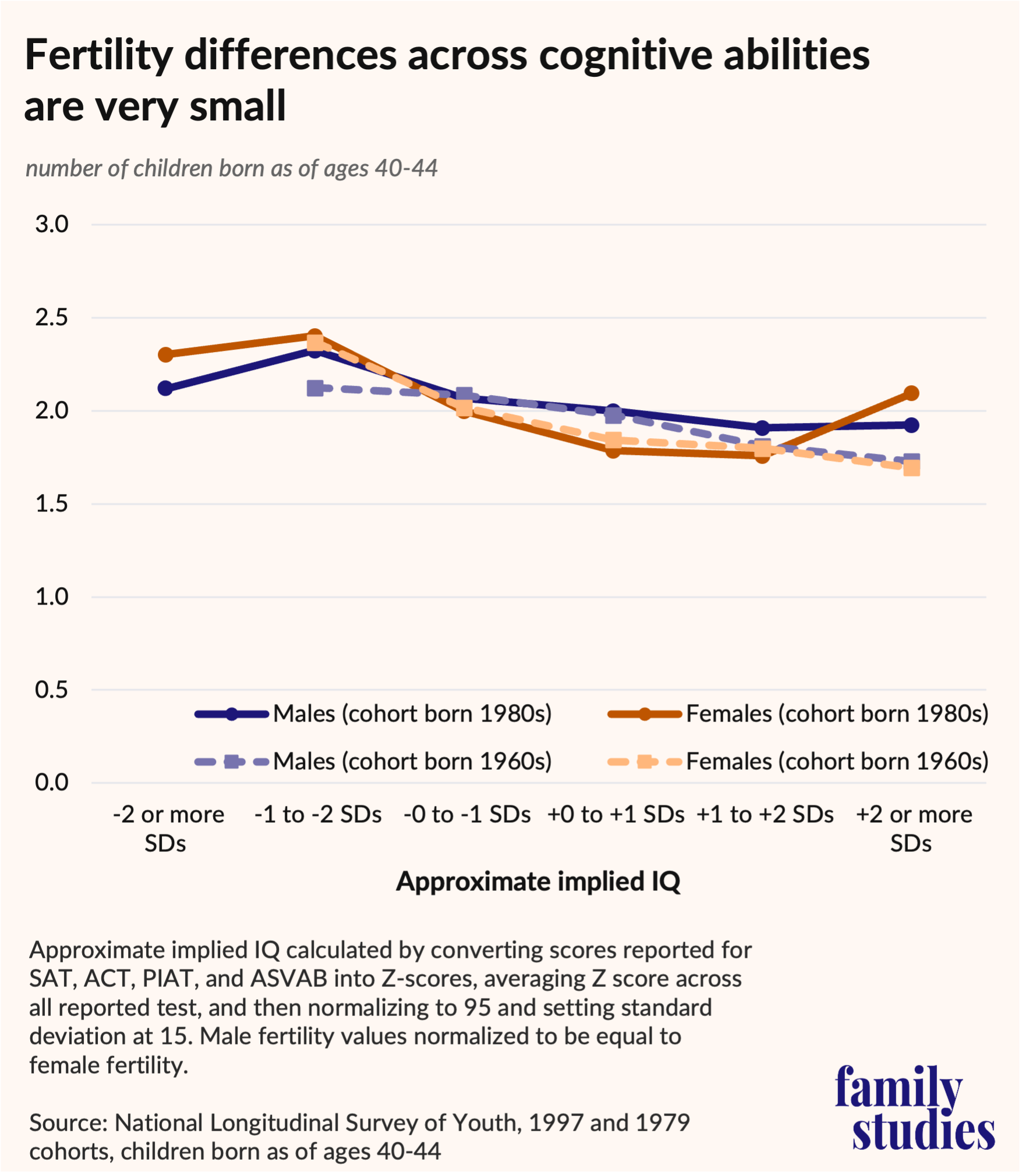 Using the National Longitudinal Survey of Youth—1997 and 1979 cohorts, we can explicitly test how cognitive ability relates to fertility and how that has changed over time. That’s because the NLSY-datasets include ACT, SAT, PIAT, and AFQT scores, as well as fertility for the respondents in their early 40s. If academic high-achievers postpone fertility longer, then relative fertility rates for high-scoring individuals could be underestimated, but broad trends should still be clear.