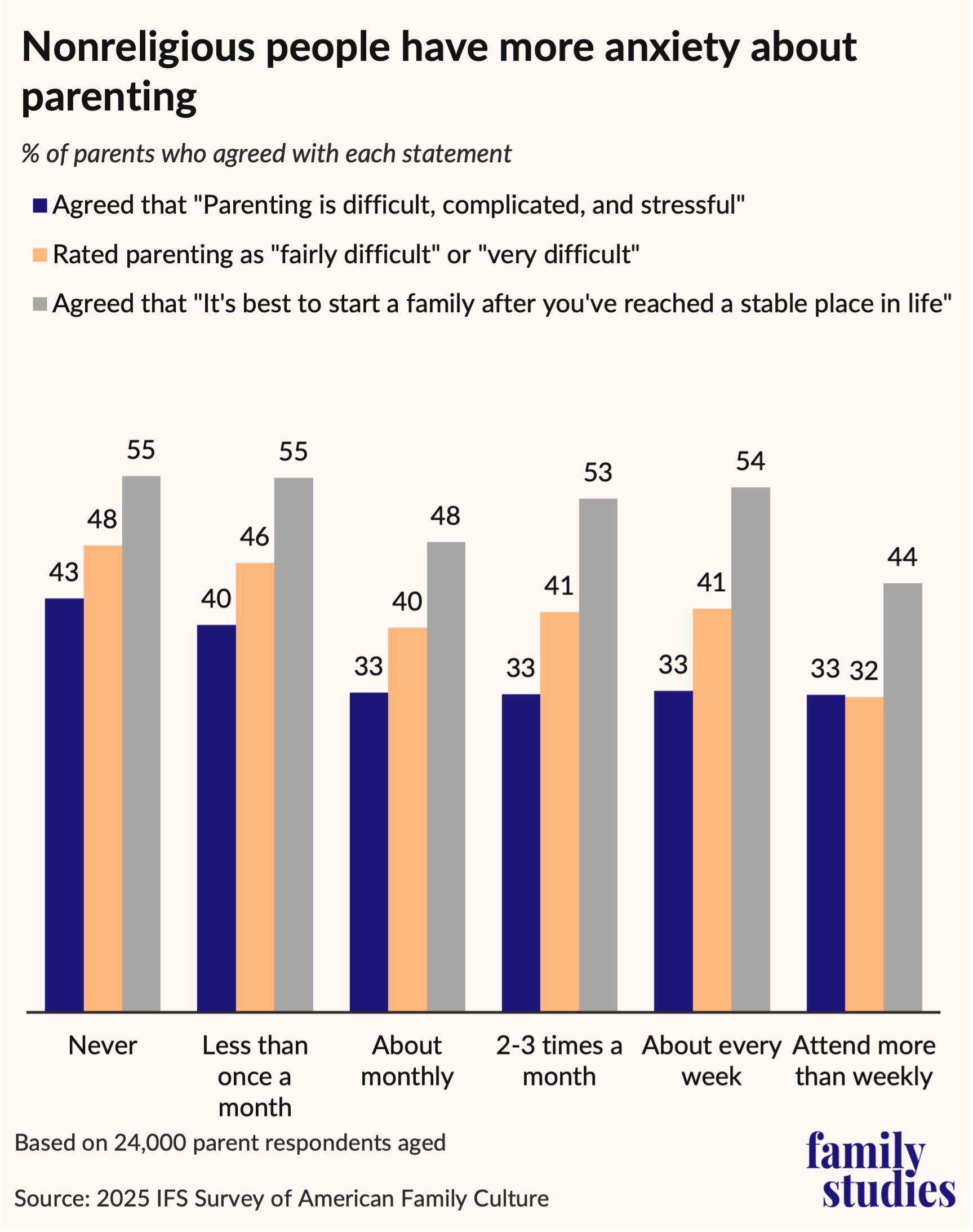 As can be seen, the most secular American parents have the highest agreement with a statement about the stress of parenting, assign the highest difficulty rating to parenting, and give the strongest endorsement to the idea of postponing family until stability, while the most devout Americans are less worried about achieving stability before kids.