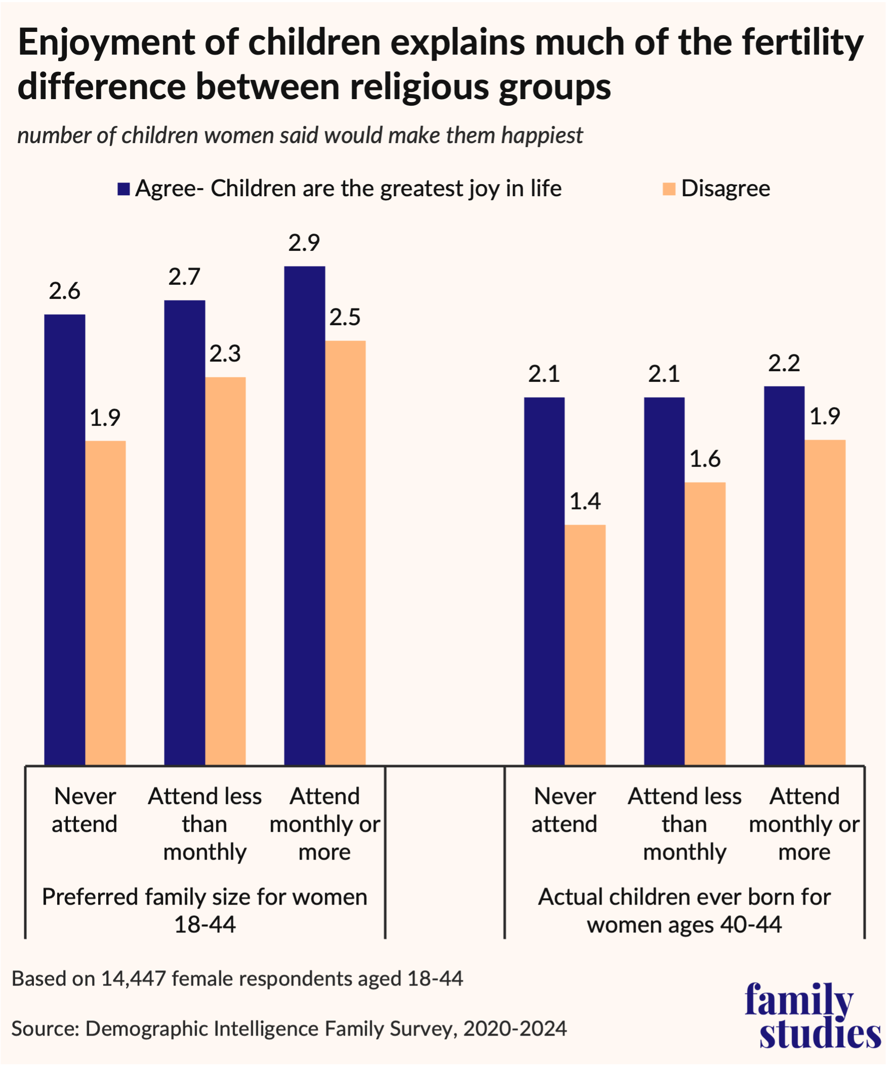 Consistent with the idea that enjoyment of being with kids is a key part of fertility motivation, and thus that state orphanages would be antinatal, the figure below shows that much of the overall difference in family desires between the religious and nonreligious is explained by views of children as a source of joy.