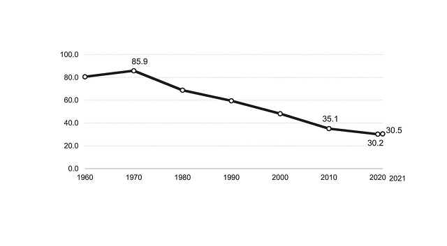 As Figure 1 indicates, the U.S. marriage rate has fallen by more than 60% since 1970. In 1970, 85.9 men and women married per 1,000 unmarried Americans 15 and up. By 2021, that number had fallen to 30.5 per 1,000. Likewise, the median age of marriage has risen for men from 23 in 1970 to 30.5 in 2022 and for women from 21 in 1970 to 28.6 in 2022. The practical significance of this is that only about 50% of American adults are currently married, down from 72% in 1960. Moreover, demographers now project that a record share of young adults, about one in three, may never marry. The bottom line is that marriage is much less likely to ground and guide the lives of American adults than it once was.