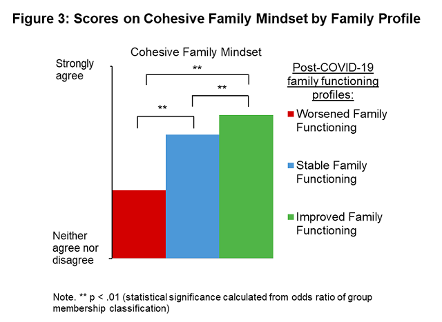 Returning to our second question—how were individuals in these family profiles different across these 11 variables? Somewhat to our surprise, only one variable significantly differentiated all three groups. That variable? Our newly developed measure of cohesive family mindset. As Figure 3 illustrates, individuals in the improved family functioning group following the pandemic reported a higher score on this construct compared to individuals in the stable and worsened family functioning profiles (i.e., had the most amount of agreement with the Cohesive Family Mindset items). Additionally, individuals in the worsened family functioning profile reported a lower score on this measure compared to individuals in the other two family profiles (i.e., had the least amount of agreement with the Cohesive Family Mindset items).