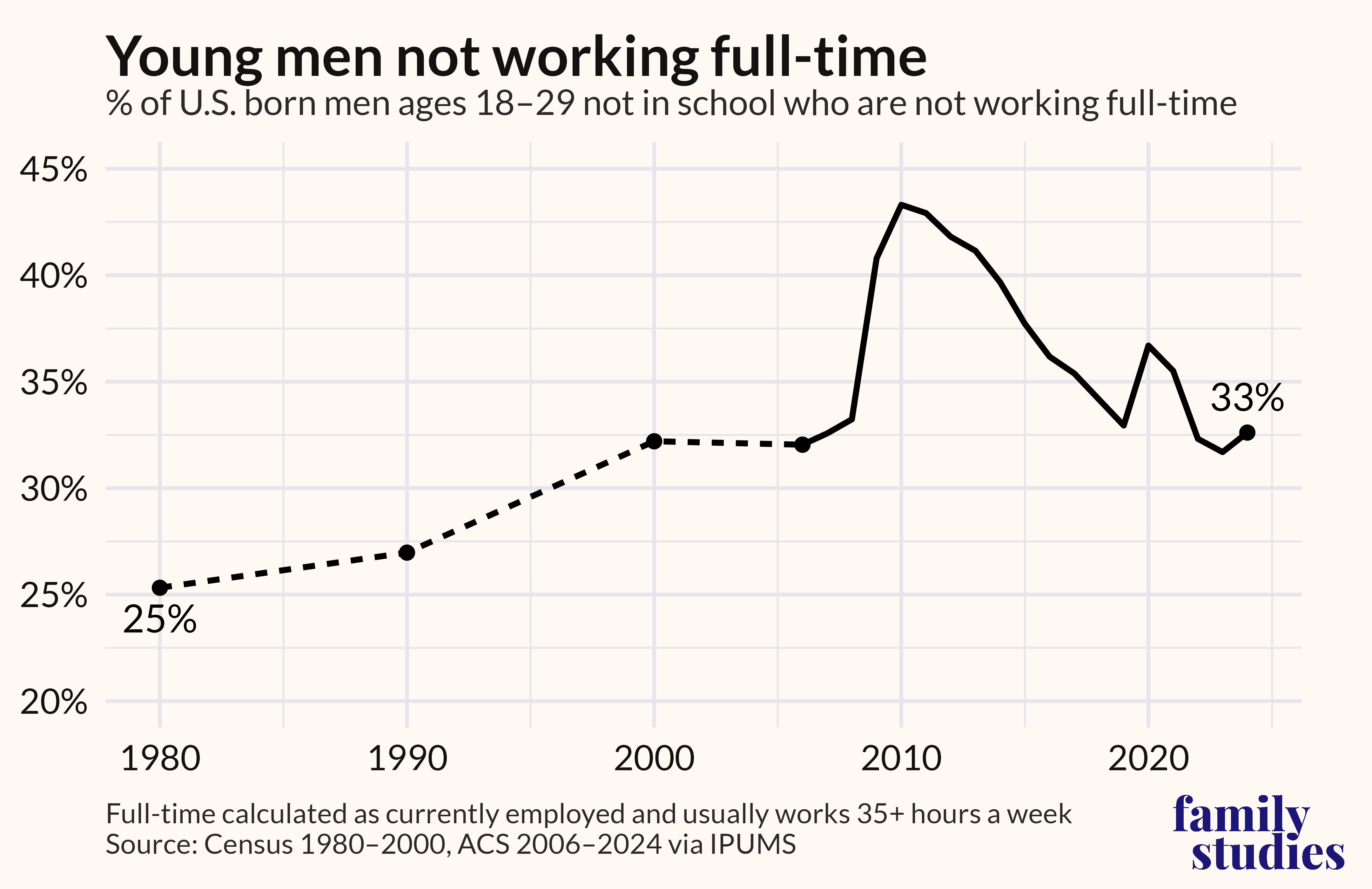 The new report from the Institute for Family Studies, America’s Demoralized Men, shows that this problem of male unemployment and underemployment has spread beyond the deindustrialized heartland. In 1980, only 25% of young men (ages 18-29, not in school) were not working full time. Today, that number has risen to 33%.