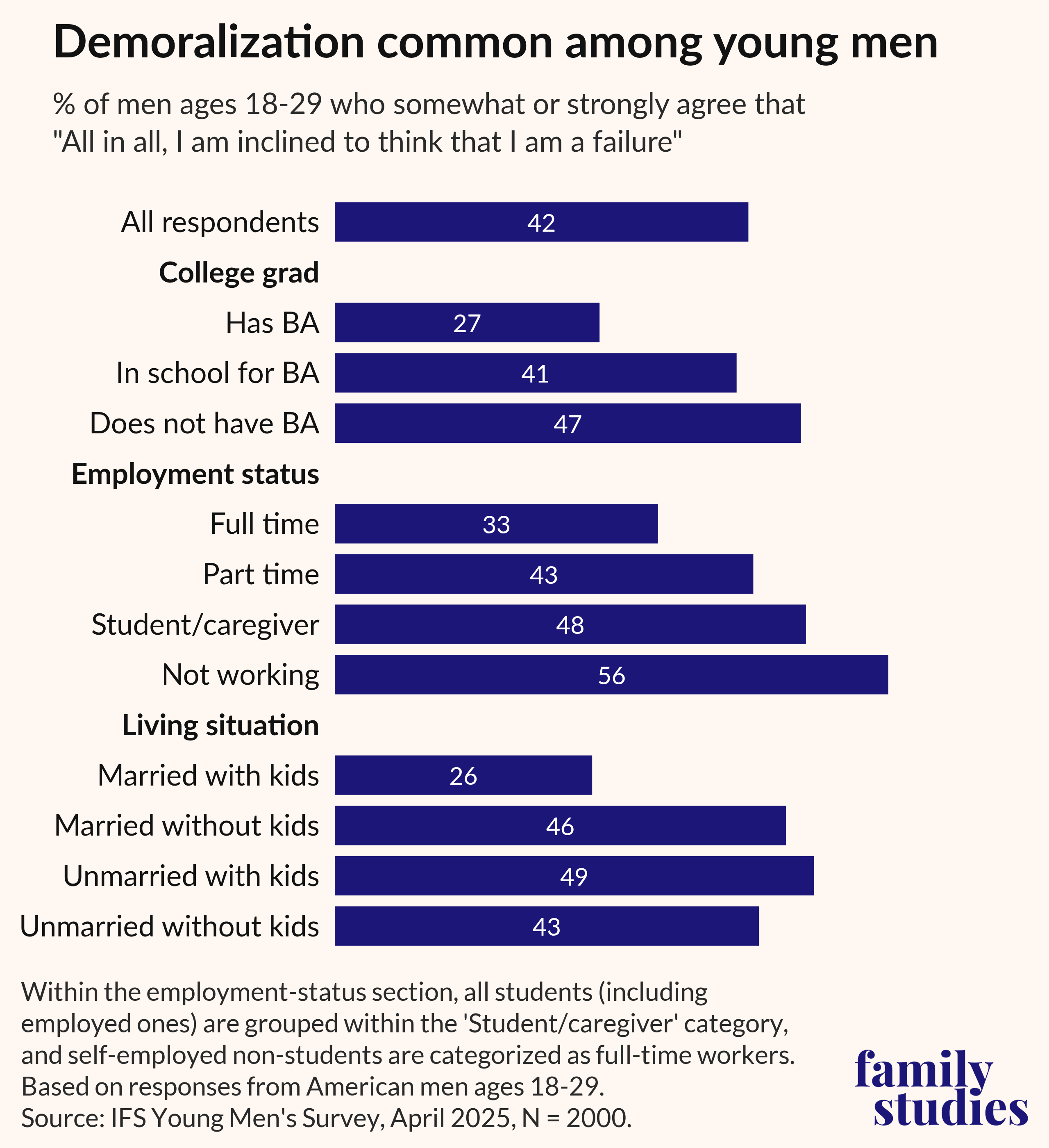 2. A stunning 42% of respondents either somewhat or strongly agree that they are “failures," especially young men who aren’t working. Post This