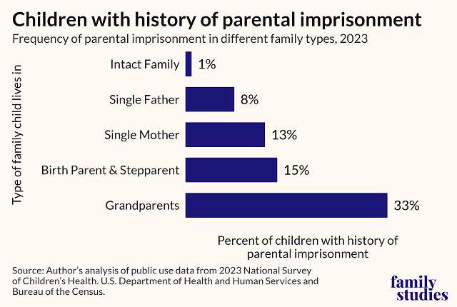 There is a strong association between the type of family in which a child grows up and the likelihood that the child will have a parent or sibling serve time in prison. As may be seen in the figure below, among children who live with their mothers only, 1 in 8 (13%) has had a parent or sibling imprisoned. The same is true of about 1 in 7 who live with a birth parent and stepparent (15%) and 1 in 3 (33%) who live with a grandparent rather than either birth parent. By contrast, only 1% of children living with both a father and mother have experienced parental or sibling imprisonment.
