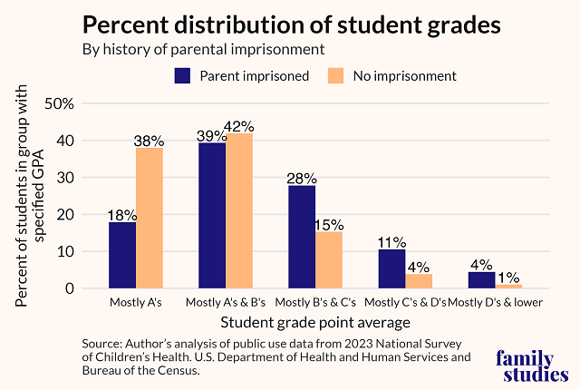 After controlling for family disruption, parent education, family poverty, immigrant status, and child’s age, sex, and race and ethnicity, the odds of getting mostly A grades are 64% lower for students with incarcerated parents than for those with no history of parental imprisonment.