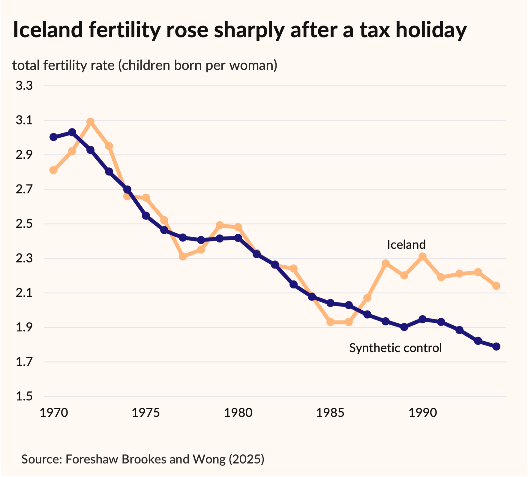 In a recent report for the Centre for Family and Education (CFE) co-authored with Ella Wong, we found that when Iceland gave its taxpayers a break for a year, fertility rose. Using a synthetic control model (an approach which simulates a counterfactual trend of Iceland’s TFR based on the trend for other countries that had a similar pattern as Iceland before the tax holiday), we found that TFR was 0.33 children per woman higher than it would otherwise have been—a very large effect in developed countries. The effect in 1987 was not statistically significant, since Icelanders only had about 3 or 4 months to conceive births in response to the tax holiday and have them in 1987, but Iceland’s fertility continued rising in 1988 before continuing its prior trend.