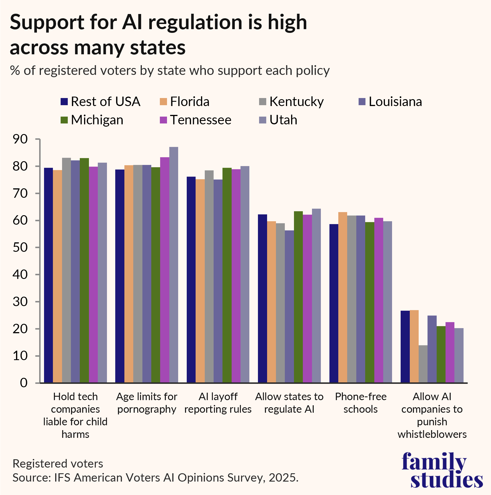Focusing first on the six key states, voters in every state we surveyed in depth are similar to the overall national average in being supportive of political candidates whose policies hold AI companies liable for harms to kids and oppose preemption, as well as cutting red tape to open AI power plants. Though Kentuckians were perhaps slightly less anti-AI, and Louisianians, Utahns, and Michiganders slightly more so.