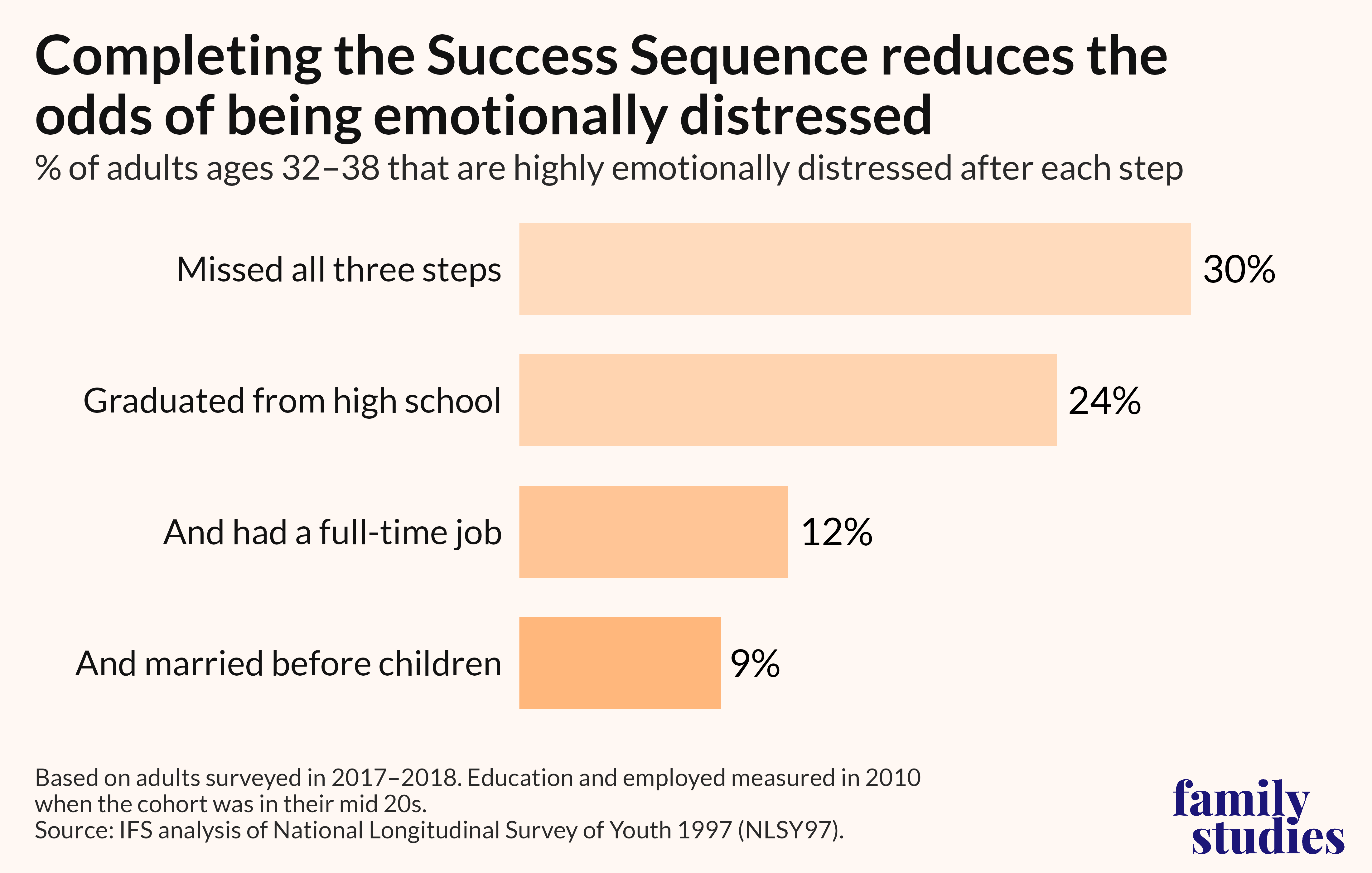And it’s not just economic success. The odds that 30-somethings are experiencing poor emotional health are cut in half for those who follow the success sequence (even after controlling for a wide range of demographic factors).