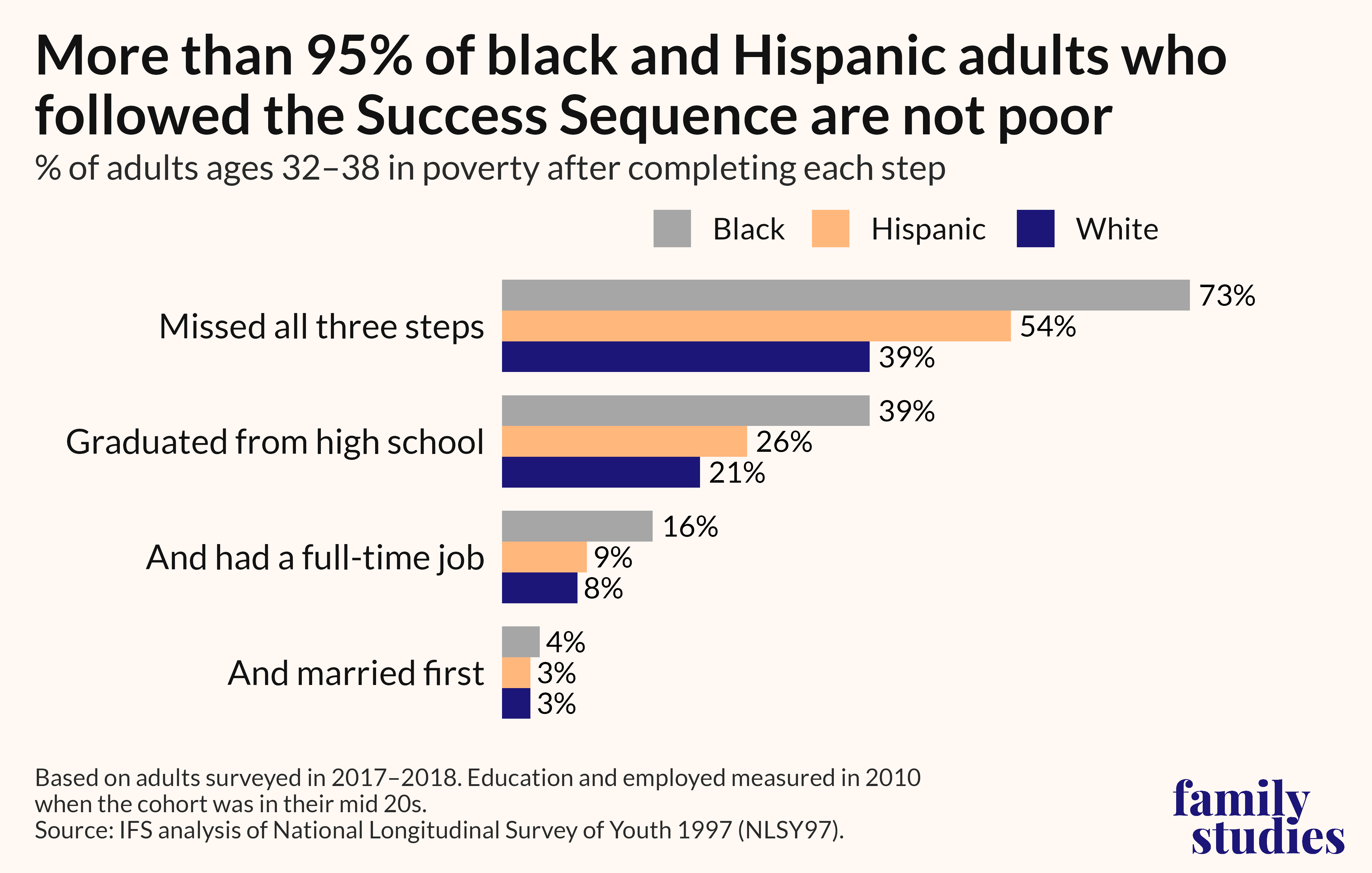 The success sequence refers to a set of early life transition markers that, when accomplished in order, are associated with very low risks of experiencing poverty. Specifically, when young people (1) complete at least a high school education, (2) become employed full time, and (3) marry before having children—in that order—then 97% of them (and any kids they may have) are not in poverty in their mid-30s, and 86% reach at least the middle class.