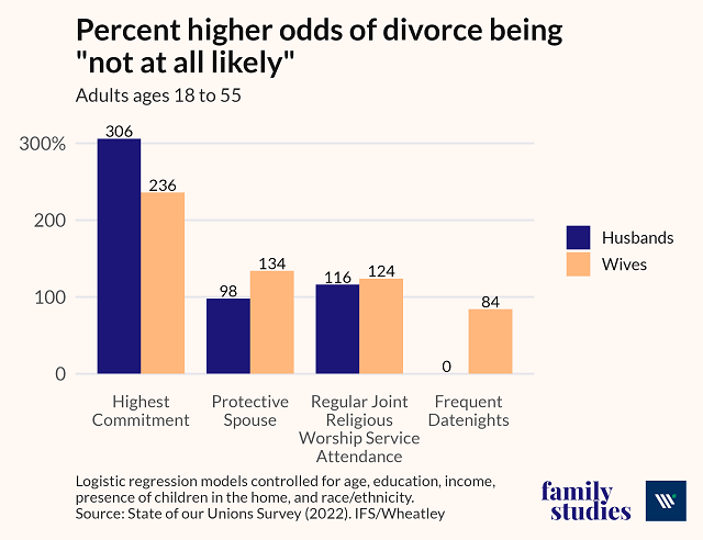 We then ran an iterative series of logistic regressions to see which of the 11 measures were most predictive of saying that divorce was “not at all likely.” After two analyses, four variables remained. The strongest predictors of feeling that one’s marriage is “highly unlikely” to end in divorce were the same predictors of being “very happy” in marriage. That is, having the highest level of commitment to one’s marriage, feeling that one’s spouse is “protective,” and regularly attending religious worship services were all strongly associated with lower proneness to divorce (see Figure 2). Having regular date nights also reduced wives’ reports of divorce proneness, but this was not the case for husbands. (See Appendix, Table 2 for details).