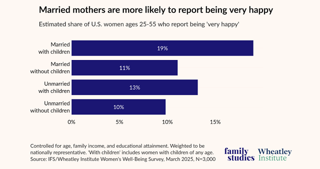 New data paint a different picture. In the 2022 General Social Survey (GSS), the nation’s leading social barometer, married mothers are happier than single childless women as well as married childless women and unmarried mothers.10 Other surveys have found similar results.11