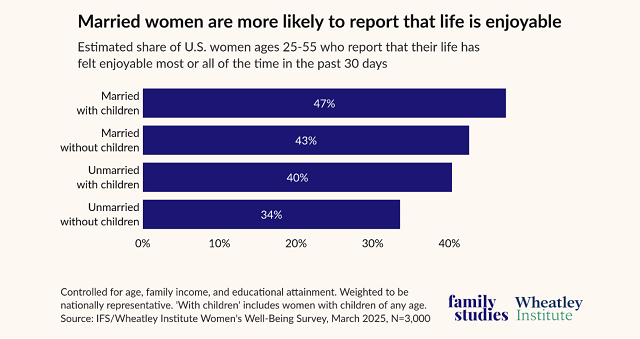 Married women are also more likely than unmarried women to say that life was enjoyable most or all of the time: 47% of married mothers and 43% of married childless women say life is enjoyable, compared to 40% of unmarried mothers and 34% of unmarried childless women.12