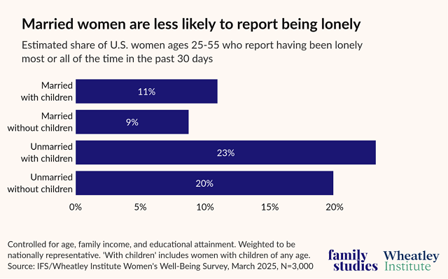 Figure 3. Estimated share of U.S. women ages 25-55 who report having been lonely most or all of the time in the past 30 days. Source: IFS/Wheatley Institute, Women’s Well-Being Survey, March 2025