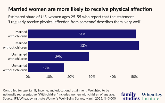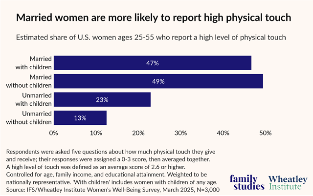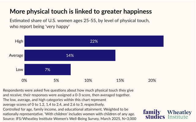 Figure 5. Estimated share of U.S. women ages 25-55 who report a high level of physical touch. Source: IFS/Wheatley Institute, Women’s Well-Being Survey, March 2025