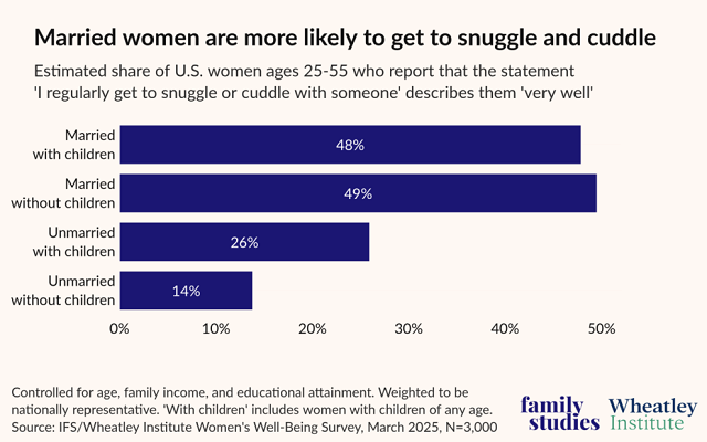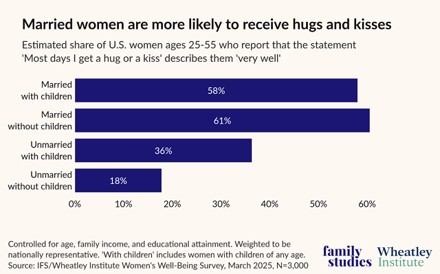 Thus, one factor that explains why married women are happier than their unmarried peers is that they have more regular opportunities for kissing, hugging, and snuggling. For example, 58% of married women with children and 61% of married women without children report that they often get hugs or kisses, while only 36% of unmarried mothers and 18% of unmarried women without children report the same.