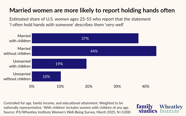 Similarly, married women are much more likely than unmarried women to say they hold hands often. Married women with children are almost twice as likely to hold hands frequently as unmarried women with children, and married women without children are over four times as likely to hold hands as often as unmarried women without children.