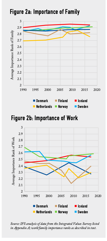 Indeed, attitudes towards work and family have changed in highly developed, highly egalitarian northern European countries. Figures 2a and 2b show the average importance rank assigned to “work” and “family” by respondents ages 18 to 55 in World and European Values Survey (WVS/EVS) questions, on a scale of zero (not at all important) to three (very important).
