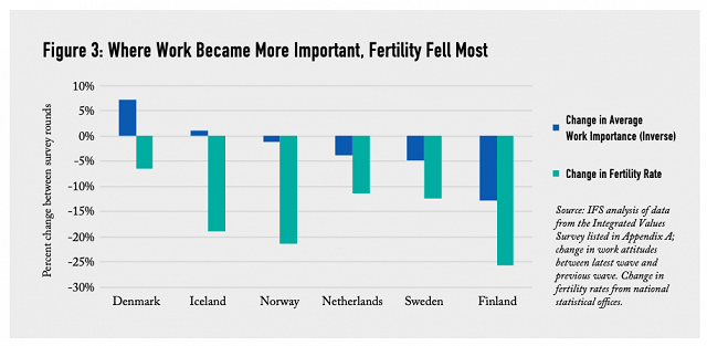 Denmark, the only Nordic country with a decrease in work importance, also had the smallest decline in fertility over the period measured. Finland, meanwhile, had the biggest rise in work importance, along with the largest fertility decline. Trends for Iceland and Norway do not fit the pattern as well, but it is no surprise that in this simple, uncontrolled approach, the correlation between work attitudes and fertility outcomes is imperfect.