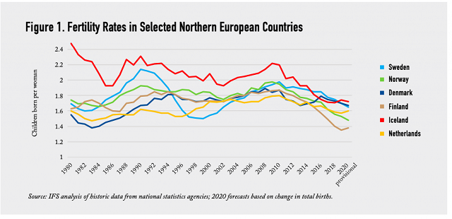 In recent years, fertility rates have fallen sharply in many countries formerly believed immune to very low fertility. Egalitarian values and generous social welfare states had been credited with protecting the Nordic countries in particular from very low fertility rates, yet since 2008, birth rates in those countries have plummeted, as Figure 1 shows.