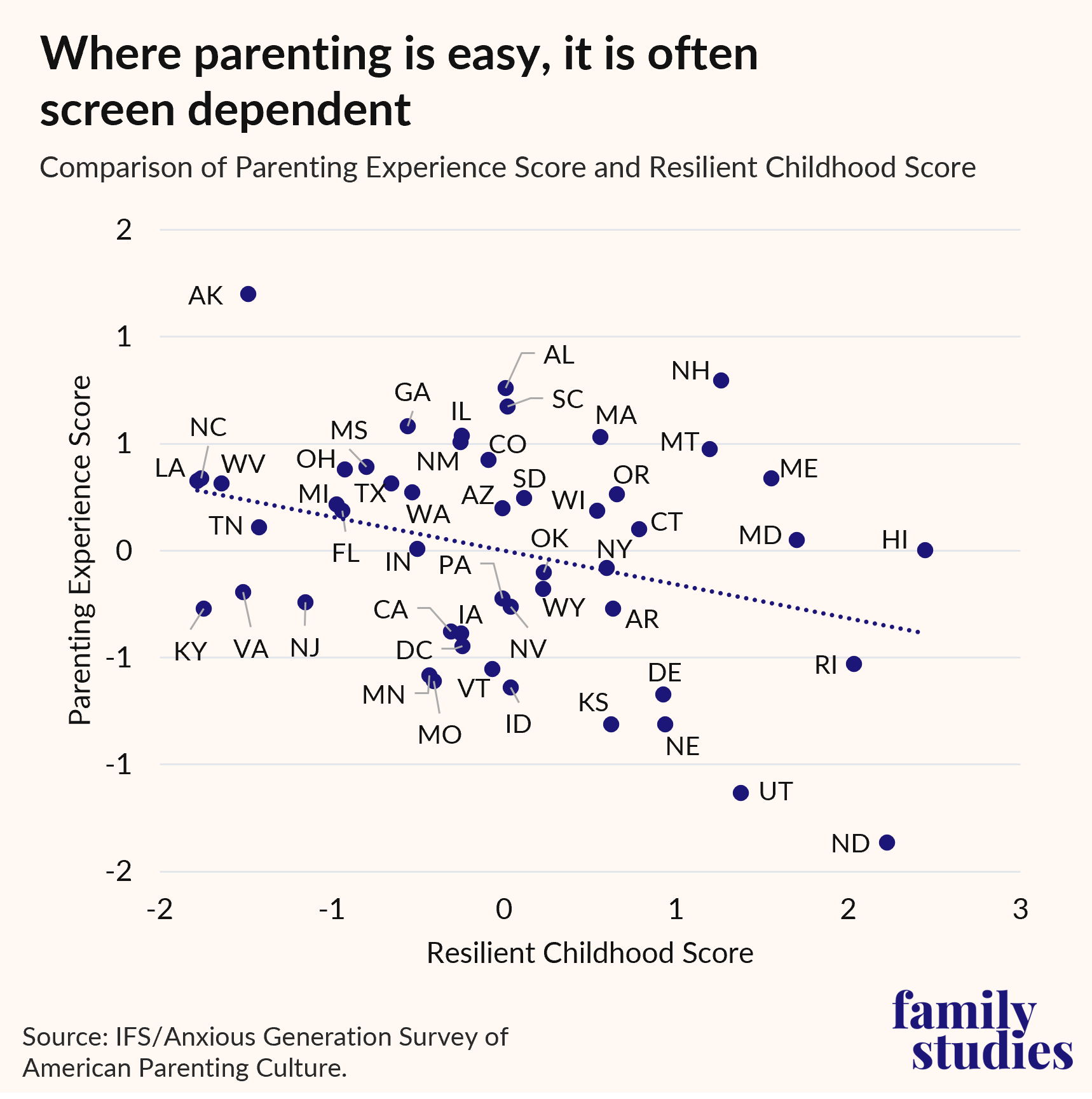 Overall, we find significant differences from state to state, but at the highest level, one broad trend stands out: in states where children get more independent play, have more varied social lives, and use digital technology less frequently, parents are exhausted. The parents still holding the line on giving their children a childhood not governed by algorithms feel that they are swimming upstream, even as their children enjoy better outcomes. In our view, this underscores the need for policies to help support these parents in their commitment to raise healthy children.