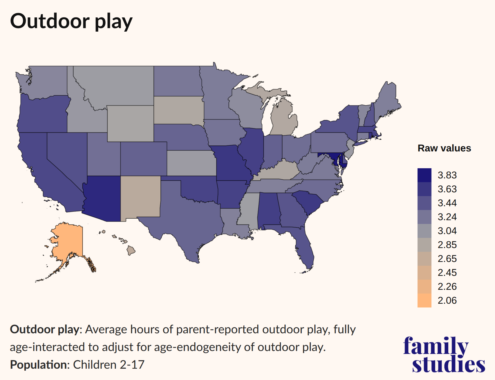 We find lower outdoor playtime in many of the more northern states, especially Alaska, Michigan, or South Dakota, and more outdoor playtime in many of the more southern states, like Arizona, South Carolina, Missouri, or Alabama, as well as Maryland.