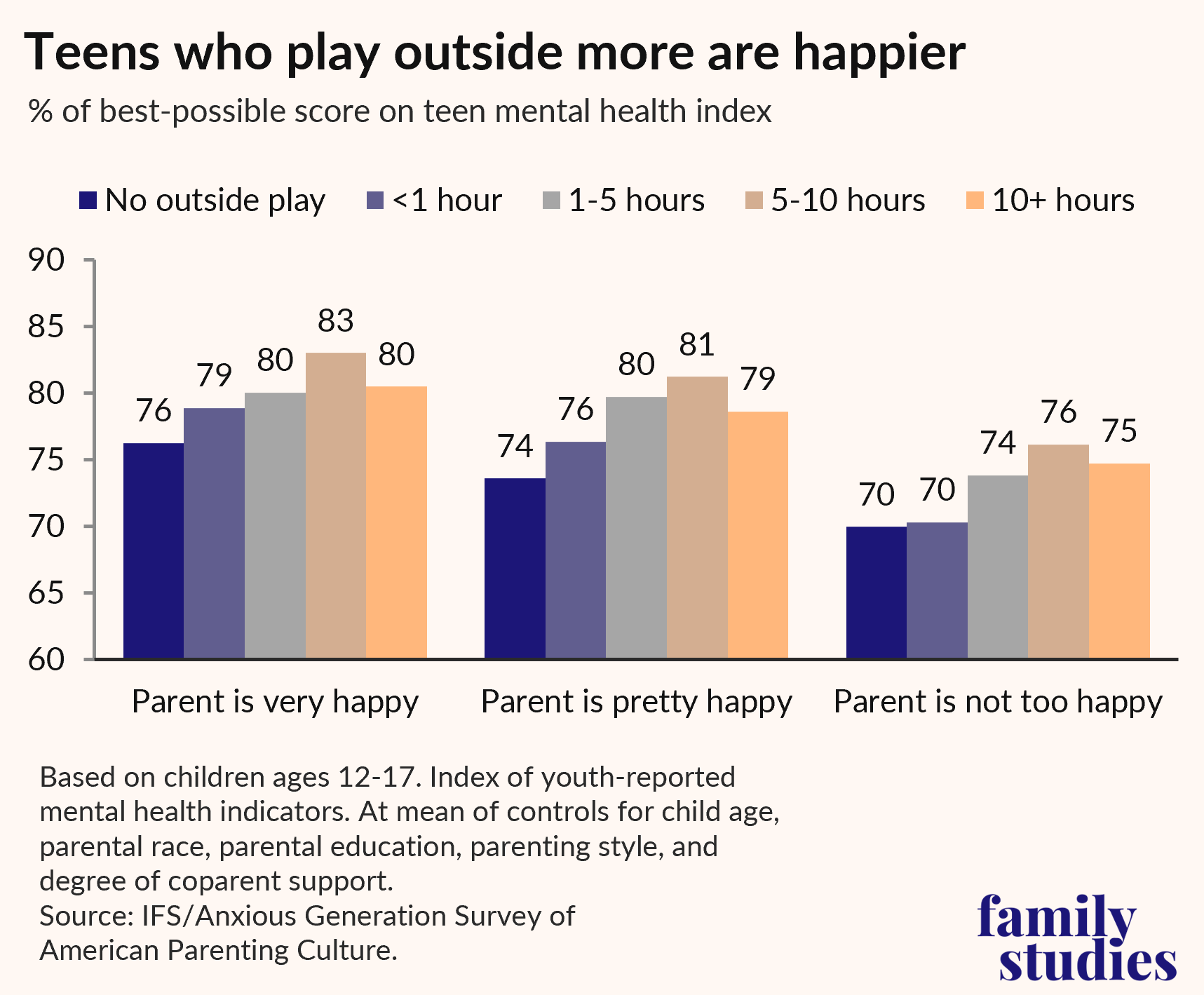 Our survey reveals a strong association between time spent outdoors and teen mental health. Teens who play more outside, we find, are happier. This is very likely to remain true even if indoor play is weather-related (and not a result of parenting style): rainy days cooped up inside are simply no fun for kids. Thus, even if our overall results for outdoor play are shaped by weather and season, we expect that the implied effects on kids would still materialize.