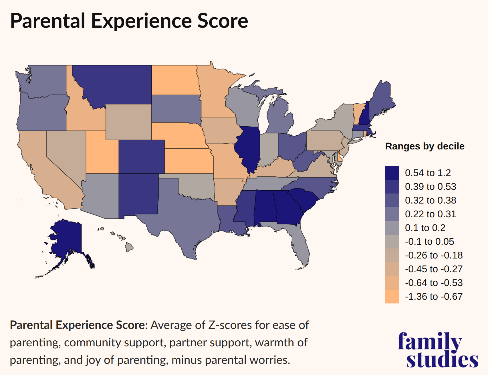 Parents feel that the work of raising children is easiest in Upper New England, the Deep South, the Midwest, and the Southwest. Parenting feels hardest along the Eastern Seaboard and in the Great Plains, while the Mountain states provide a mixed experience.