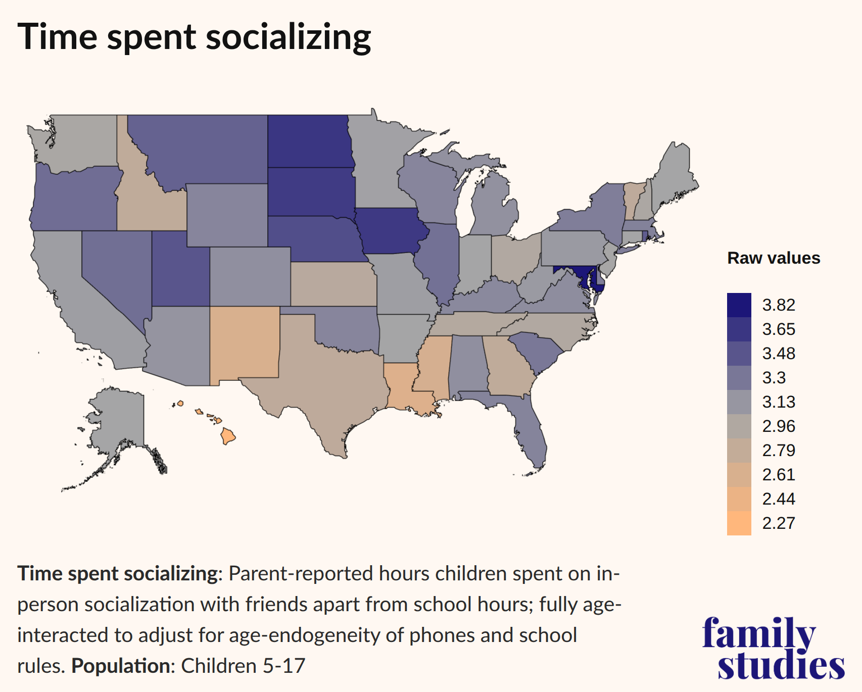 Like the previous map (i.e., “Favor more independent play”), we see that parents in the Plains and Mountain states tend to report that their children spend relatively more time with their friends. It is perhaps important that the states that foster the most in-person time among children (more than three hours per week) are also the same states that most strongly believe that children need more autonomous play and allow children the most freedom of movement.
