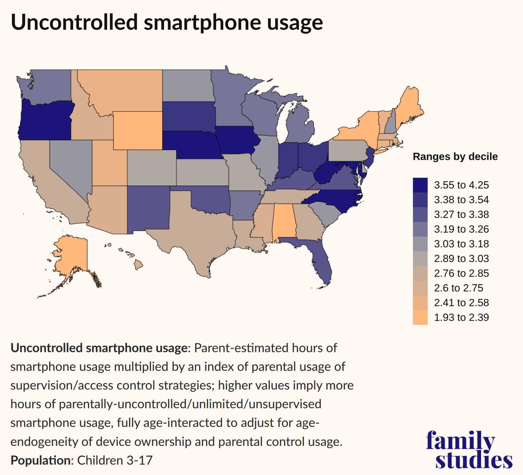 This map displays uncontrolled smartphone use by state. As kids get older, their parents are likelier to allow them uncontrolled smartphone use, and so our estimates for each state are the average estimate across each age group. In other words, we are eliminating any bias due to the age mix of children in the families we surveyed.