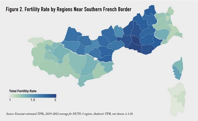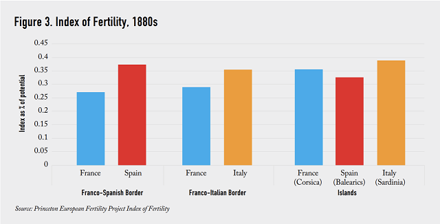 French Corsica has higher fertility than Italian Sardinia; the French side of the Franco-Italian border has sharply higher fertility, as does the French side of the Franco-Spanish or even Franco-Andorran border. These discontinuities