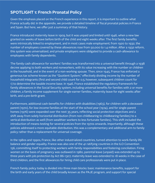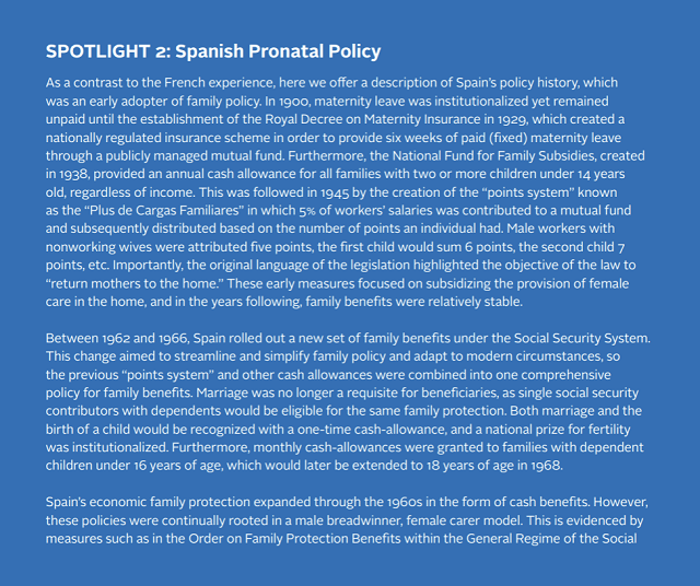 That said, in this report, we do not attempt to provide a blueprint for pronatal policy, for the simple reason that no such blueprint will look the same in any two countries. Despite some broad similarities, the challenges facing Spain are not the same as those facing Italy, and similar headline fertility rates often mask quite large underlying differences. Policies implemented in one context cannot be expected to have the same effects in other contexts, where underlying economic structures and cultural norms may be different.