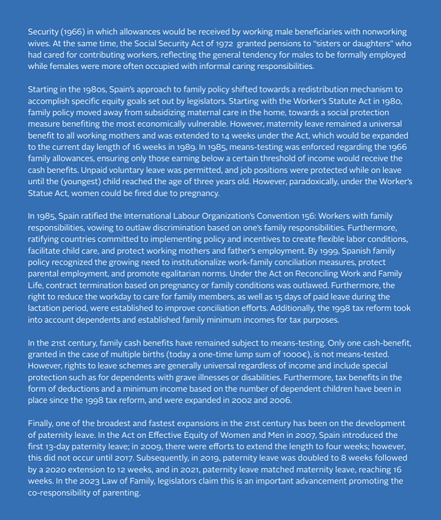 France and Spain’s family policies reflect distinct approaches to supporting families. France emphasizes universal support for parents, viewing children as a social investment and offering a range of benefits and programs to alleviate the cost of child-rearing. In contrast, Spain’s family policies have traditionally been more targeted either just to dependents of male breadwinners, or to the economically needy, with recent efforts to provide broader support still lagging France in terms of comprehensiveness, generosity, and flexibility. The differences in policy reflect broader societal values and priorities regarding family and child care, with France’s policies more forthrightly pronatal (rather than anti-poverty or promoting traditional gender roles), and thus offering greater agency and choice to parents in managing work and family life.