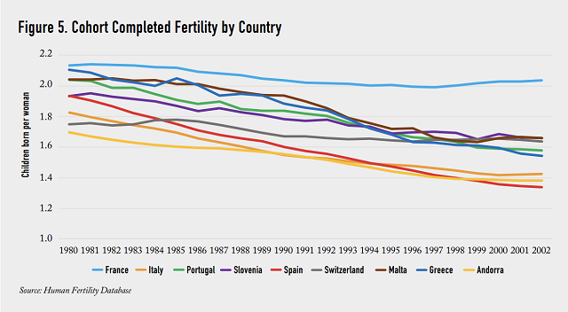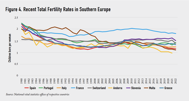 In recent years, fertility rates in much of southern Europe have fallen to extraordinarily low levels: 1.4 children per woman in Portugal, 1.33 in Greece, 1.24 in Italy, 1.16 in Spain, 1.1 in Malta, and a shockingly low 0.97 in Andorra. Even French fertility, relatively higher at 1.7 children per woman, is now falling, leading French Premier Emmanuel Macron to call for new policies to stimulate “demographic rearmament.” Although the extremely low birth rates of Korea, Japan, or other east Asian countries are widely remarked upon, the similarly low birth rates of much of southern Europe are less well known and understood.