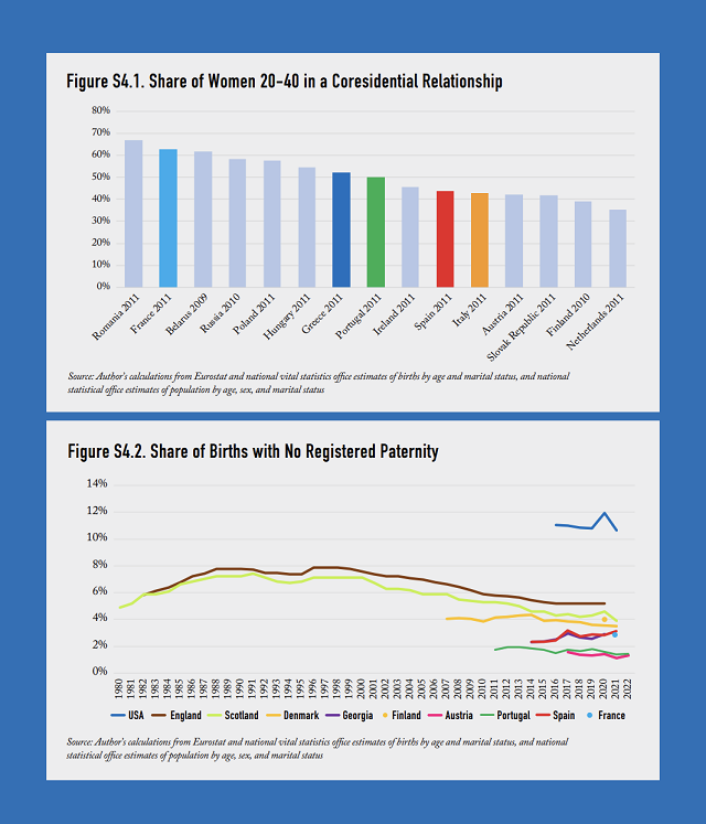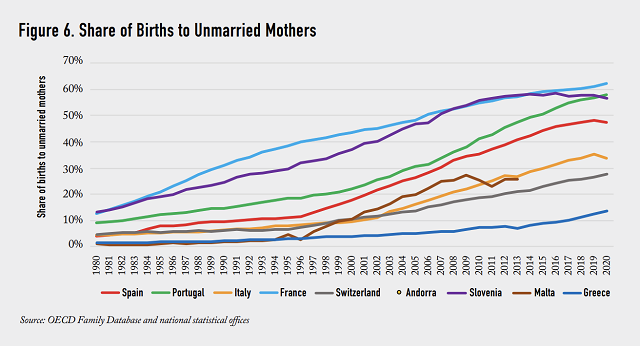 In France, the average woman will have one child outside of a married relationship, and 0.7 children inside a married relationship. France’s very high nonmarital fertility rates are striking, but it should also be noted that French women have more children within marriage than Portuguese or Spanish women (though not Italian women). French women have higher fertility than women in much of southern Europe regardless of marital status, and so France’s higher fertility cannot be attributed simply to higher nonmarital births. In other words, even if Spain or Portugal had the same environment for, and low stigmas around, nonmarital fertility as France, both countries would still have appreciably lower fertility.