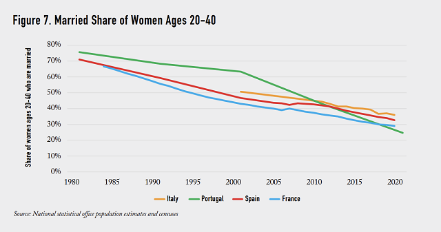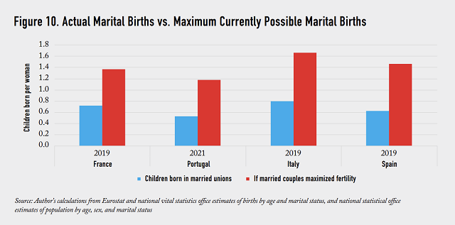 As can be seen, even if every married woman in France, Portugal, Italy, or Spain bore children at the “natural” fertility rate for a woman of her age, marriage rates are nonetheless so low that overall fertility from married couples would remain below 1.7 children per woman in every country. Differences in marital composition alone explain approximately 75% of the gap between pre-modern natural fertility rates and observed fertility rates. Among married couples in each country, their fertility relative to natural fertility varies: Spanish married women have unusually low fertility within marriage, while Italian and French women have fairly high fertility within marriage.