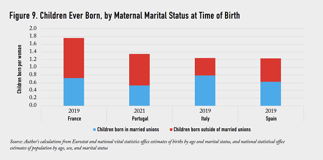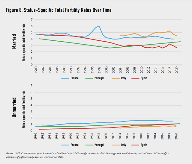For Portugal, Spain, and France, the ratio of marital to nonmarital fertility has stabilized around three: women of a given age are about three times as likely to have a child as unmarried women of the same age. In Italy, this ratio has stabilized around six. On the whole, this suggests that Italy’s nonmarital fertility may be unusually low compared to its marital fertility; but for the other countries, there is no reason to imagine nonmarital fertility can serve as a major source of higher fertility. That’s because nonmarital fertility is already quite high compared to marital fertility.