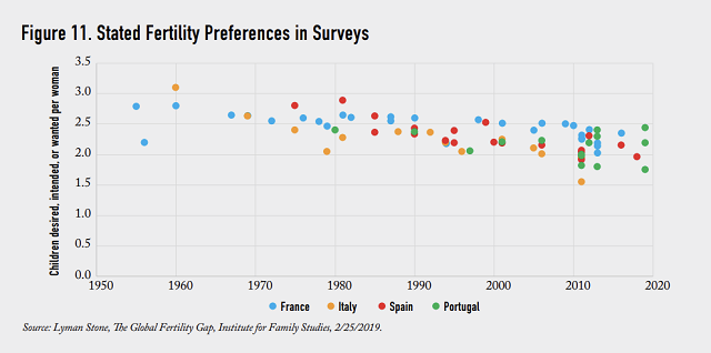 Since 2000, the lowest fertility preference reported by French women was intended fertility in 2013, at 2.03 children per woman. But since 2000, there are numerous surveys yielding fertility preferences below 2 children per woman in other countries: Spanish women in 2018 reported only desiring 1.96 children, Italian women in 2011 desired only 1.95 and intended just 1.55. Portuguese women’s intentions were below 2 in 2011, 2013, and 2019, as were Spanish women’s intentions in 2011. Thus, a core part of the French difference is not simply a difference in fertility realizations but fertility goals. French women want bigger families than their southern neighbors.