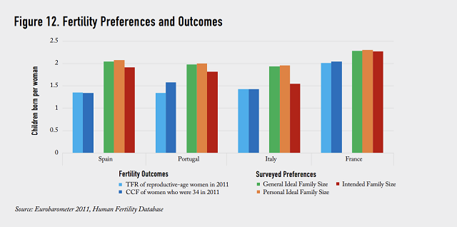 However, even among married couples, fertility rates have fallen over the last few decades in much of southern Europe. A key factor shaping low fertility in Spain, Portugal, and Italy is the generally low desired family size in the region: women in southern Europe not only face obstacles to having children, they also simply desire fewer children than their